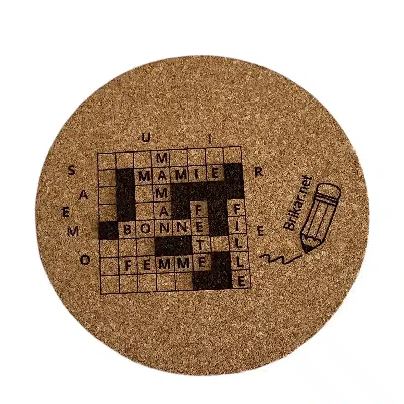 • Sous-verre rond en liège mot croisés gravé au laser